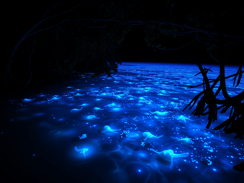 Due to the dinoflagellates, Mosquito Bay glows noctilucus. This light is produced by single-celled organisms whenever they are disturbed, through actions like getting agitated by movement in the water.